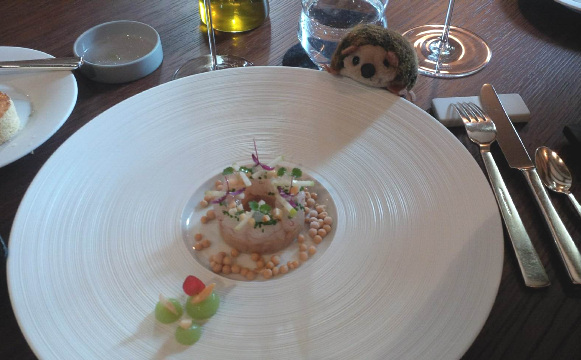 Passt überdies perfekt zur Suppe, der Igel beginnt mit ersten Verbeugungen gen Küchentür! Noch immer sind wir nicht am Ende dessen, was Christian Bau bescheiden den "Prolog" nennt, also die Ouvertüre vor dem eigentlichen Menü.