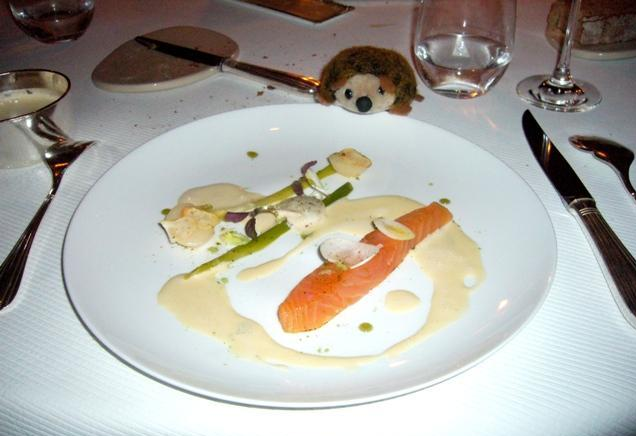 Auch der marinierte, lauwarm angerichtete schottische Wildlachs mit Frühlingsgemüsen schwamm in perfekter Beurre Blanc. Ja, auch da war nicht viel gekocht, eher ist hier einfach nur ein Spitzenfisch mariniert und mit einer sensationellen Sauce angerichtet worden. Aber das reicht ja.