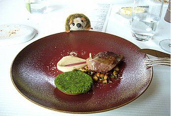Noch so ein Hammer: Die Fera aus dem Genfer See. Wir diskutierten ein wenig mit der deutschen Frau des Chefkochs, ob Fera denn nun ein Felchen oder eine Renke sei, entschieden uns dann aber dafür, diese Frageoffen zu lassen, so wie der Mund uns offen stand, als wir das Ding probierten. Butterzart, mit kräftigem aber elegantem Eigengeschmack. Der von dem Petersilienwurzelpüree und den Meerrettichtalern, mit denen der Fisch serviert wurde noch wunderbar unterstrichen wurde. Auch hier gab es als Gimmick wieder eine Sauce zum Drübergießen, eine Beurre Blanc vom Allerfeinsten, ganz leicht mit Zitrone angesäuert. Ich gestehe, dass es nicht allein die Notwendigkeit zur Intensivierung meines Bestecksports, sondern auch die pure Genusssucht war, die mich dazu angestachelt hat, den Rest einfach mit dem Löffel aus der Sauciere zu futtern.
