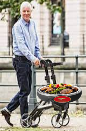 Plötzlich nähert sich ein vital aussehender, attraktiver End-siebziger mit seinem Golden Ager Grillator (jetzt voller Zoom auf das Emblem), auf dem ein saftiges Steak und allerlei buntes Gemüse appe-titlich vor sich hin brutzeln und einen unwider-stehlichen Duft verströmen.
